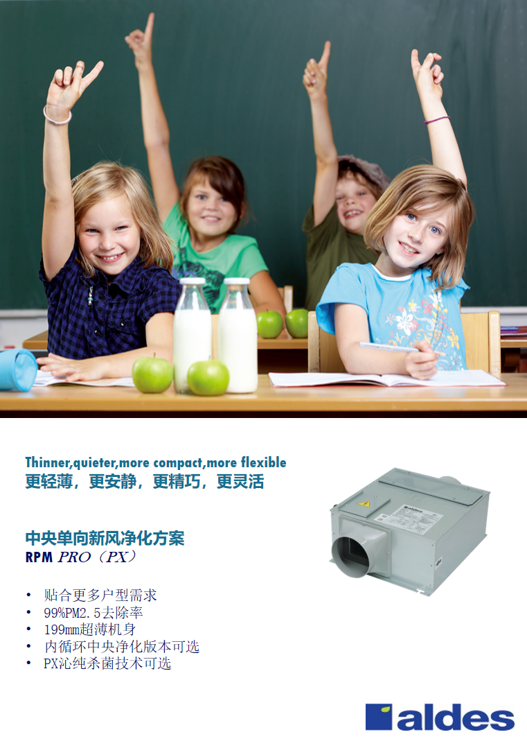 在季節(jié)變化差異不大的地區(qū),空調(diào)季節(jié)較短。Aldes可以提供RPM PRO (PX)系列解決方案。抵擋室外霧霾、汽車尾氣、花粉柳絮,同時源源不斷的將室外的氧氣引入室內(nèi),提高室內(nèi)的含氧量,改善室內(nèi)空氣成分,帶來健康生活。