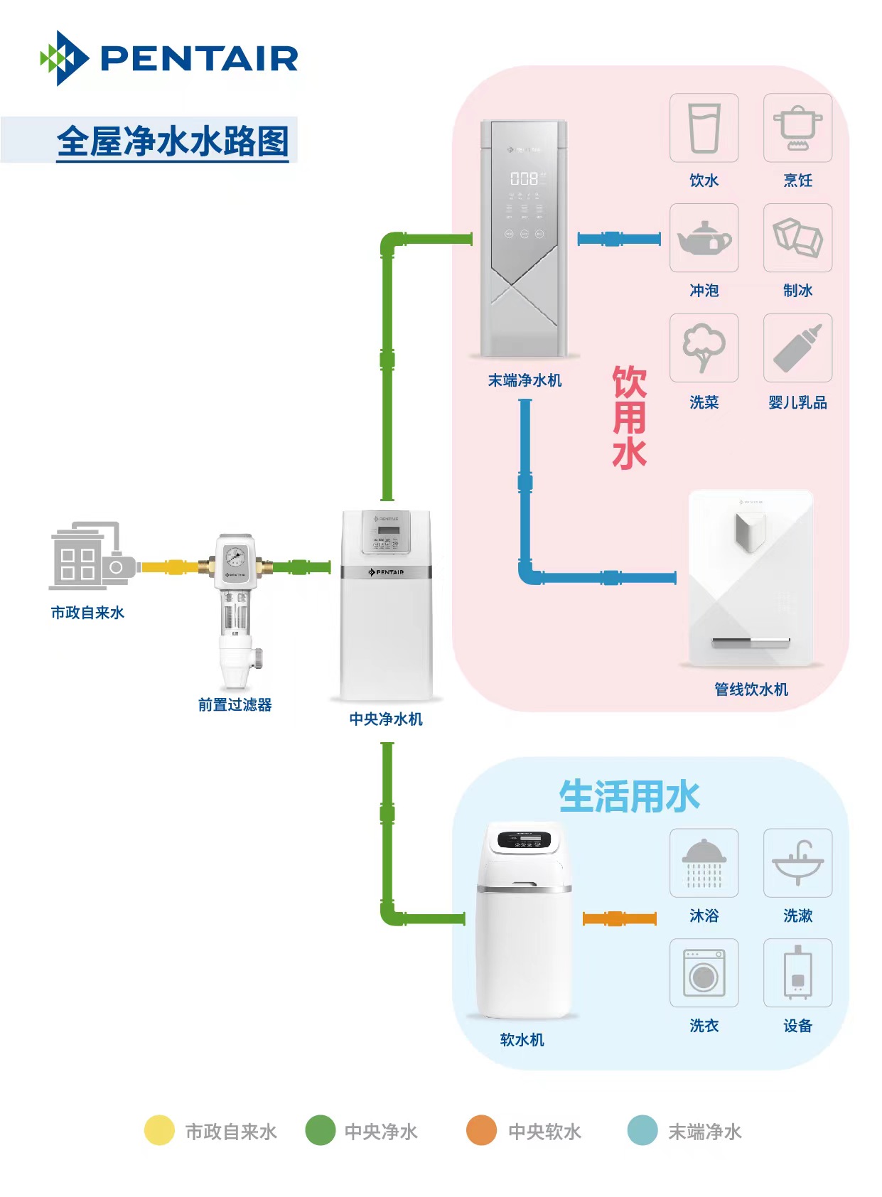 全屋凈水一般分為四步,包括:前置過濾、中央凈水器、中央軟水器、廚下直飲。若再加一個(gè)就是管線機(jī)